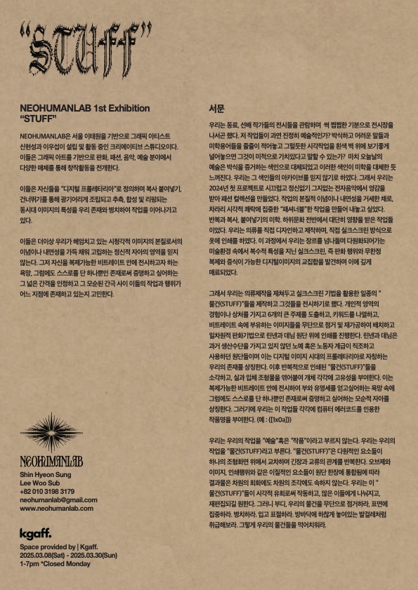 신현성과 이우섭이 설립 및 활동중인 아트 콜렉티브 NEOHUMANLAB의 전시 “STUFF”가